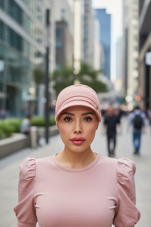 Perfecta para personas en tratamiento oncológico, con alopecia o simplemente para quienes desean un accesorio versátil que cuide y realce su imagen. Disponible en color palo de rosa. Talla única.