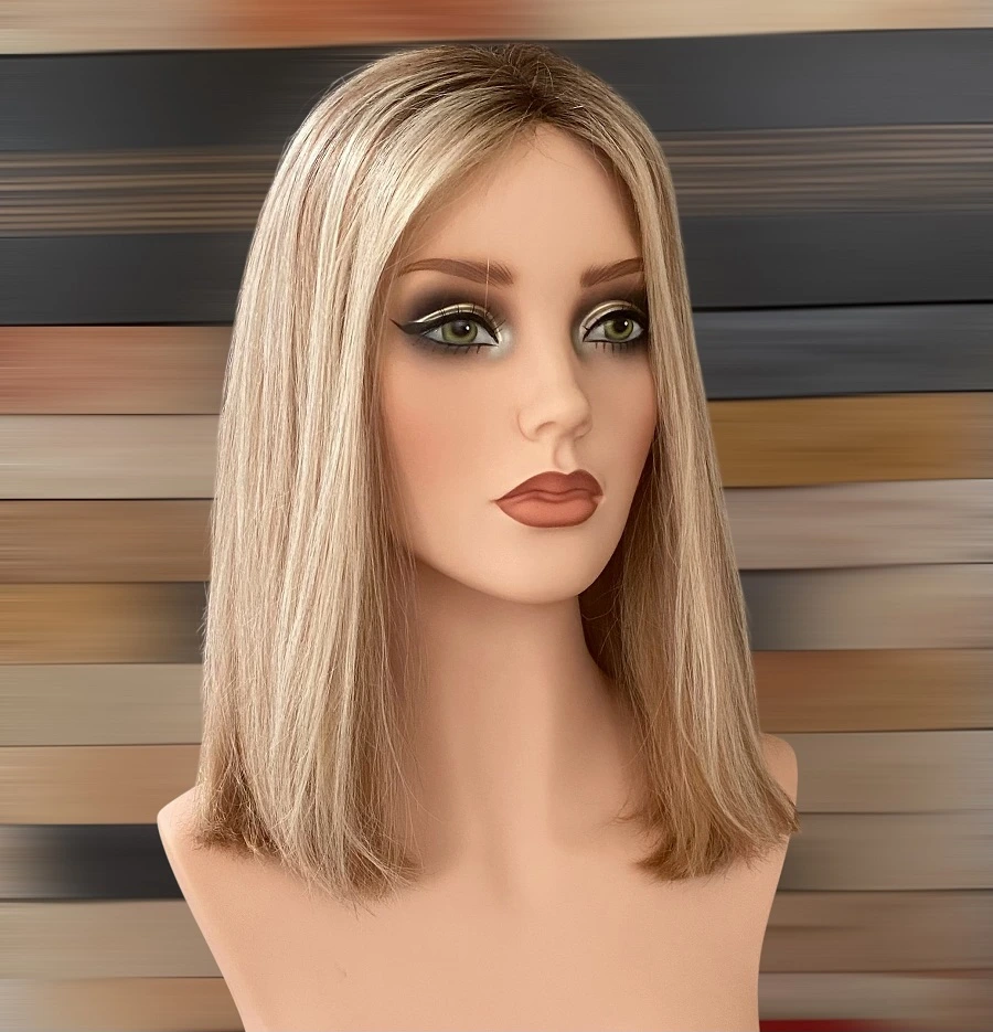 La Peluca Chloe tiene con un corte en capaz, de tonalidad rubio , elaborada en cabello 100% humano el cual puede aplanchar y cepillar. Con simulación de cráneo el cual está realizado con seda suiza de la más alta calidad, trabajado a mano pelo a pelo creando visualmente un cuero cabelludo natural, ligero y transpirable, multidireccional lo cual se puede peinar para cualquier dirección y realizar el peinado que se desee, como si fuera su propio cabello. Ajustable en los laterales de la parte interna para que quede a la medida de la cabeza. El monofilamento en el vértice la vuelve transpirable, el gorro es cómodo, suave, transpirable e hipo alergénico. Nuestras pelucas están construidas en sistema SKINFIX concepto para un resultado de ventilación del cuero cabelludo y materias primas extremadamente suaves que ayudaran al acoplamiento de la sensibilidad. Todas nuestras pelucas fueron construidas y diseñadas para responder a las necesidades médicas especiales de los clientes que sufren la pérdida de cabello debido a los procedimientos médicos como la radiación, quimioterapia o alopecia.