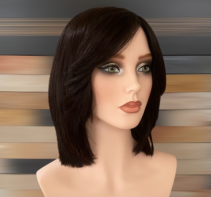Hermosa peluca que tiene con un corte en capaz moderno y elegante dándole un estilo sutil, de tonalidad castaño oscuro. Elaborada en 100% humano y con simulación de cráneo el cual está realizado con seda suiza de la más alta calidad, trabajado a mano pelo a pelo creando visualmente un cuero cabelludo natural, ligero y transpirable, multidireccional lo cual se puede peinar para cualquier dirección y realizar el peinado que se desee, como si fuera su propio cabello. Ajustable en los laterales de la parte interna  para que quede a la medida de la cabeza. El monofilamento en el vértice la vuelve transpirable, el gorro es cómodo, suave, transpirable  e hipo alergénico. Las pelucas están construidas en nuestro sistema SKINFIX concepto para un resultado de ventilación del cuero cabelludo y materias primas extremadamente suaves que ayudaran al acoplamiento de la sensibilidad. Todas nuestras pelucas fueron construidas y diseñadas para responder a las necesidades médicas especiales de los Clientes que sufren la pérdida de cabello debido a los procedimientos médicos como la radiación, quimioterapia y alopecia.