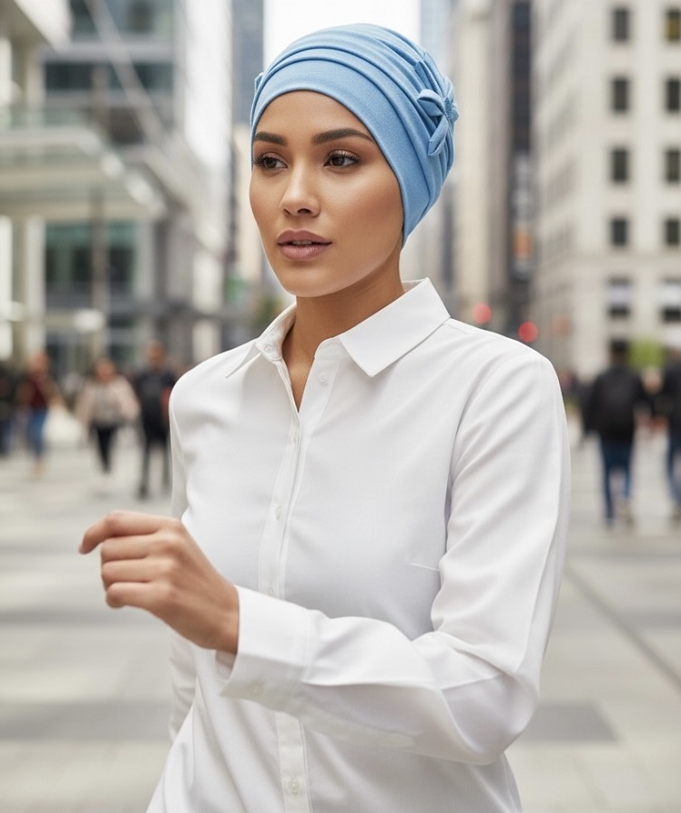 Perfecta para personas en tratamiento oncológico, con alopecia o simplemente para quienes desean un accesorio versátil que cuide y realce su imagen. Disponible en tono azul.